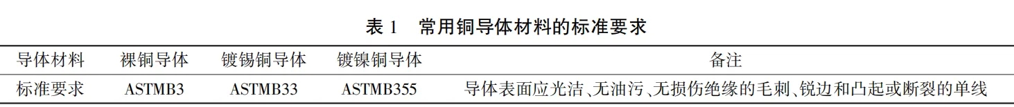 但是大部分企業(yè)仍然把銅作為導(dǎo)體層的主要材料,首先銅的電阻率較低,其次銅大部分性能都優(yōu)于同級(jí)別的鋁,如載流量大、電壓損失低、能耗低和可靠性強(qiáng)等。目前導(dǎo)體選材一般采用國(guó)標(biāo)6類軟導(dǎo)體(單根銅絲伸長(zhǎng)率必須大于25%,單絲直徑小于0.30)去保證銅單絲柔軟性、韌性強(qiáng)。表1列出了常用的銅導(dǎo)體材料所需要滿足的標(biāo)準(zhǔn)。