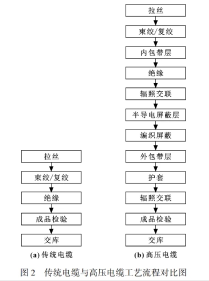 目前,電動(dòng)汽車用高壓電纜的發(fā)展迅速,對(duì)應(yīng)的成型工藝也與傳統(tǒng)電纜的成型工藝大有不同,兩種工藝流程對(duì)比如圖2所示。