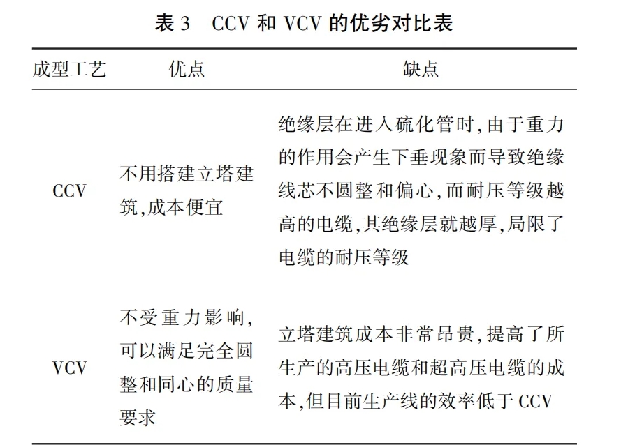 對(duì)于高壓XLPE電纜的生產(chǎn)基本采用懸鏈?zhǔn)礁煞ń宦?lián)(CCV)和立塔式干法交聯(lián)(VCV)兩種成型工藝,實(shí)際上兩種工藝生產(chǎn)的電纜都存在交聯(lián)不充分等問題,會(huì)在絕緣層留有部分交聯(lián)副產(chǎn)物,對(duì)電纜的性能都有一定的影響,表3為兩種工藝的優(yōu)劣對(duì)比。